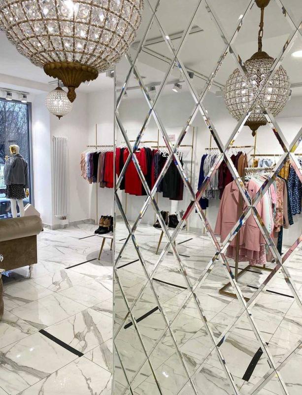 Использована зеркальная плитка "вытянутый ромб" с фацетом.