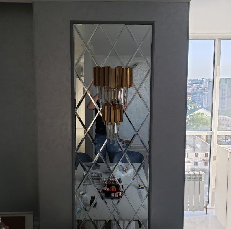 Использована зеркальная квадратная и треугольная плитка с фацетом.